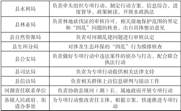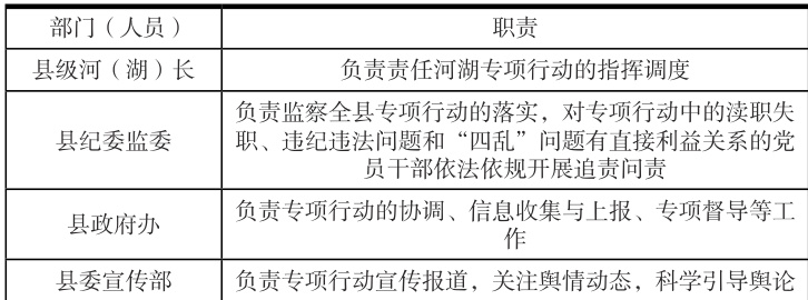 (2)明确责任分工。明确的责任分工是确保专项行动顺利开展的关键,在行动实施过程中,不同部门有着各自不同的责任分工,具体如表1 所示。