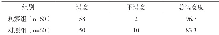 观察组患者的护理满意度为 96.7% ,显著高于对照组的 83.3% ( χ2=6.78 ,P<0.05 )。见表 1 。