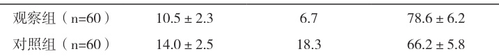 观察组患者的住院时间为( 10.5±2.3 )天,较对照组的( 14.0±2.5 )天缩短 3.5 天( 1=6.89 , P<0.05 );并发症发生率为 6.7% ,低于对照组的18.3% ( χ2=4.56 , P<0.05 );生活质量评分为( 78.6±6.2 )分,较对照组的( 66.2±5.8 )分提高 12.4 分( 1=10.23 , P<0.05 )。见表 2