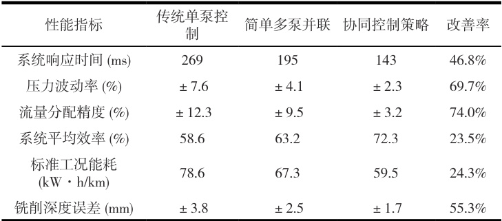 实验平台是在XM200 型路面铣刨机基础上改造构建而成,其配置有由3 台变量柱塞泵和 4 台变量马达组成的多泵多马达液压系统。控制系统采用基于 32位 ARM 处理器开发的嵌入式控制器,该控制器可实时运行所设计的协同控制算法,测试方案设计出五种典型工况,分别为空载启动工况、标准铣削工况、变深度铣削工况、突变负载工况和连续变负载工况[4]。在每种工况下分别对传统单泵控制方案、简单多泵并联方案和所提出的协同控制方案进行测试,测试指标涵盖系统压力波动率、流量分配精度、能量利用率、动态响应时间及铣削深度精度,实验会重复进行5 次,将平均值作为最终结果以确保数据可靠性。