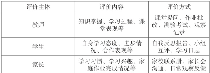 评价主体多元化,教师、学生、家长等;评价方式多样化,综合运用笔试、口试、操作实践、成长记录袋等评价方式;评价标准多样化,根据学生的不同特点以及学习目标确定不同的评价标准。