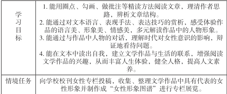 授课对象为旅游服务与管理专业学生,女生居多,笔者综合了国编教材中“中外文学作品研读”篇目,补充阅读篇目,提取了“女性形象”作为阅读探究的切入点,选取了《静女》《氓》《祝福》《雷雨》《致橡树》五个文本,以时间先后为序赏析文本,将学习目标和情境任务设置为: