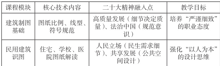 专业课程是职业教育课程思政建设的基本载体,要深入树立专业课教学内容(如图纸绘制规范、建筑类型表达、数字化工具应用)、实训与实践活动,结合学生特点、行业发展和价值理念,深入挖掘梳理二十大精神的融入点(见表1),有机融入课堂。