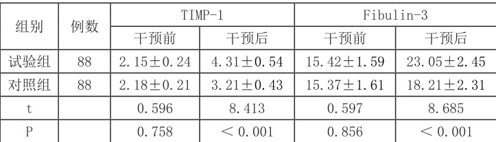预后,试验组血清TIMP-1、Fibulin-3 水平均高于对照组,差异均有统计学意义 (p<0. .05)。见表2。表 2 两组患者血清 TIMP-1 和 Fibulin-3 水平( x±s , ng/ml )