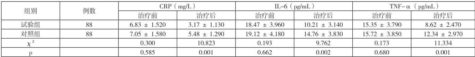 干预后试验组CRP、IL-6、TNF-α 水平均明显低于对照组患者, (p<0.05) 。结果详见表3。