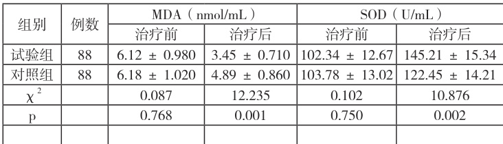 干预后试验组MDA、SOD 水平均明显优于对照组患者, (p<0.05) 。结果详见表4