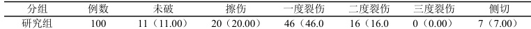 两组一度裂伤无差异性, P>0.05 ;研究组的二度裂伤和侧切比对照组低,未破、擦伤比对照组高,三度裂伤例数相同, P<0.05 ,数据见表1。