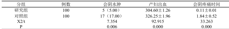 分析两组产妇会阴情况(未破、擦伤、一度裂伤、二度裂伤、三度裂伤、侧切)和会阴水肿、产妇出血和会阴疼痛时间。