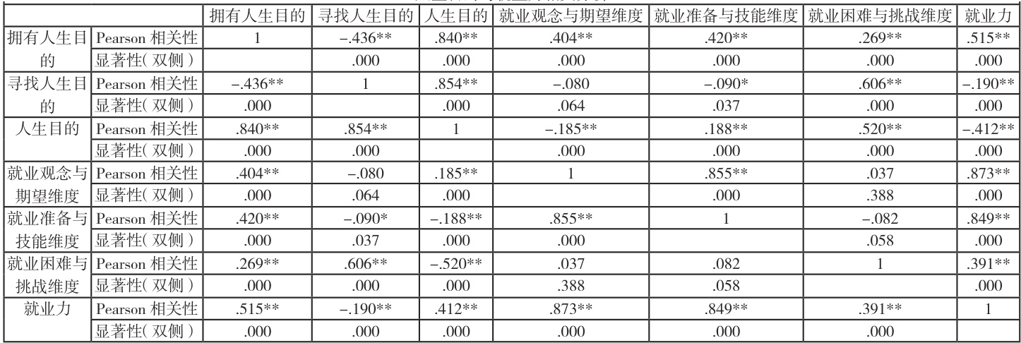 从下表的相关分析结果来看,人生目的与就业力整体呈显著正相关。具体到各维度:拥有人生目的与寻找人生目的呈显著负相关;拥有人生目的与就业力总分及三个子维度均显著正相关;寻找人生目的与就业力总分、就业观念与期望及就业困难与挑战维度呈显著正相关;就业困难与挑战维度与就业力、人生目的及其维度均显著正相关;其他维度间的相关性不显著。