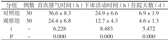 观察组术后首次排气时间、下床活动时间及住院天数均显著短