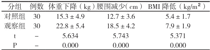 观察组术后 3 个月体重下降幅度、腰围减少值及 BMI 改善程度均优于对照组( P<0.05 ),见表2。