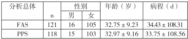1.1.1 临床资料本次 临床观察入选受试 者 124 例,6 例脱落,最终121 例受 试 者进入全分析集(FAS)分析总体; 118 例受 试者进入符合方案集(PPS)分析总体。全部 病例均签署 知情同意书。 见表 1。