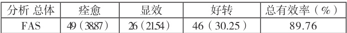 2.1 疗效结果 医用 皮肤敷料辅助 治疗非慢性创面第 14天后,FAS 集总有效 率为 89.76% ,较治疗 前差异有统计学意义 (P< 0.05);PPS 集总有效率为 91.24% ,较 治疗前差异有统计学意义(P<0.05 )。见表2。