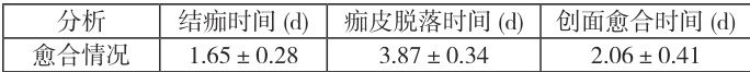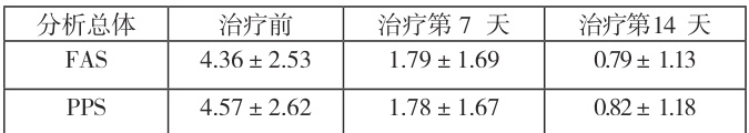治疗后第 7 天、第 14 天,VAS 瘙痒自我评价 积分较治疗前均有明显降低,差异有统计学意义(均 P<0.000 1 );FAS 与PPS 结果相似,见表3。患者创面愈合情况见表 4