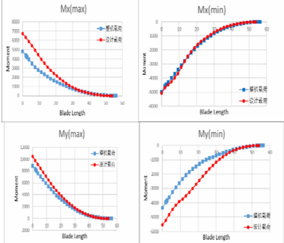 由图可知,在 Mx(min)工况下,叶片长度 15m 之后,设计载荷略小于整机载荷。延长后的安全因子满足要求。