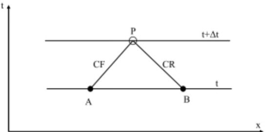 特征线示意图如图 1 所示,在一段管道中,一般认为水锤波速 a 为一常量,因此 CF 与CR 为两条直线。管道中的 A、B 两点通过 CF 与 CR 这一组特征线相交于 P 点,对 AP 进行积分可以得到满足正向特征线的方程式,见公式(1),相对的,对 BP 进行积分可以得到满足反向特征性的方程式,见公式(2)。