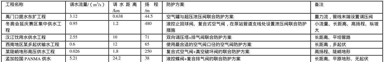 为确保供水系统的安全与稳定运行,近年来已有多种类型的水锤防护装置被应用于实际工程中。随着研究的不断深入,人们逐渐认识到,针对不同的工程条件,应结合管道布置形式、运行特性等因素,选取差异化的防护措施。在同一工程中,防护手段并非越多越好,单一措施也难以完全消除水锤风险。因此,通常需要在同一系统内合理组合多种高效措施,以兼顾经济性与防护效果,实现系统的安全、平稳运行。本文对近年来部分已建工程中的水锤防护方案进行了归纳与分析,可为后续的水锤防护研究与工程设计提供有价值的参考[6-8]。