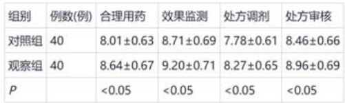 观察组合理用药、效果监测、处方调剂、处方审核评分均明显高于对照组 (P<0.05), 。见表1。