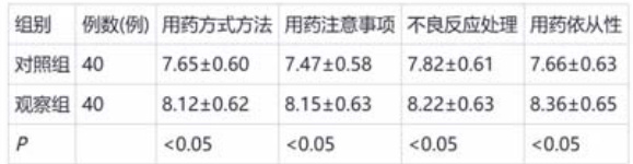 观察组用药方式方法、用药注意事项、不良反应处理、用药依从性评分均明显高于对照组 (P<0.05) 。见表2。