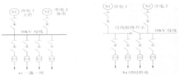 ③ 仅设置一路高压电源,另设一路低压备用电源,此方式通常适用于高层建筑;