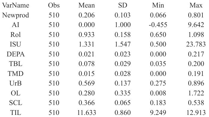 3. 中介变量,本文选取 ISUit 产业结构优化、 Rolit 劳动力资源错配指数作为中介变量。具体而言: ISUit (产业结构优化)借鉴潘珊等学者的研究,采用第三产业产值与第二产业产值之比来度量产业结构优化程度。