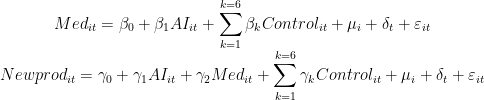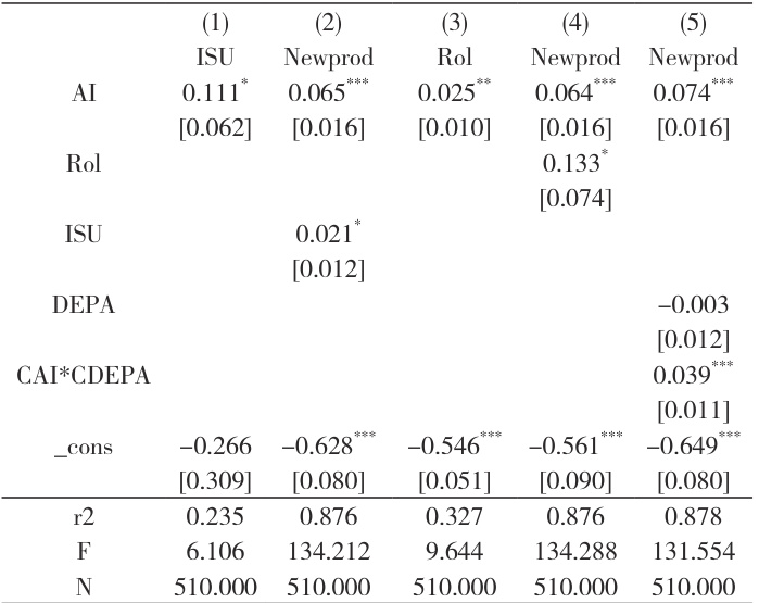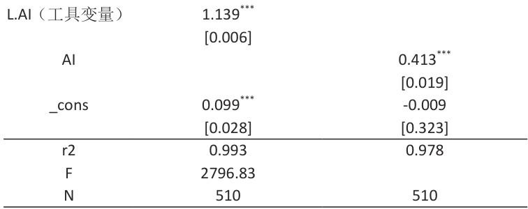 其中 Medit 为中介变量,具体包括 (劳动力配置效率)和(产业结构升级)。公式(2)主要检验人工智能 ( AIit ) 对中介变量 ( Medit ) 的影响。