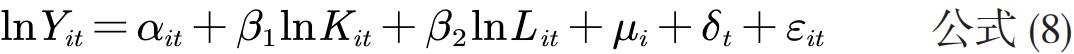 其中 Yit 表示 地区第 χt 年的国内生产总值; Kit 表示 i 地区第 t 年的资本存量,即固定资产投资; Lit 表示 i 地区第 t 年的劳动力数量; μi 和分别为个体固定效应和时间固定效应, εit 为随机干扰项。而公式中的