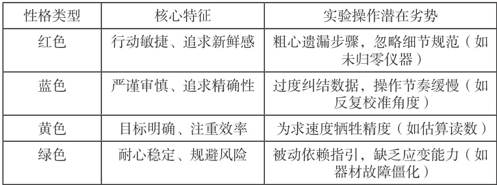 将性格色彩理论应用于初中物理实验操作教学中,能够帮助教师更好地了解学生的性格特点,采取“性格 - 实验”适配性教学策略,一方面真实提高了学生的实验操作素养;另一方面减少了因性格习惯造成的失分。在今后的教学中,教师可以进一步深入研究性格色彩理论在物理及其他学科教学中的应用,不断探索更加有效的教学方法和策略。