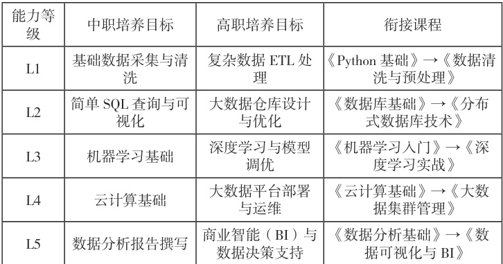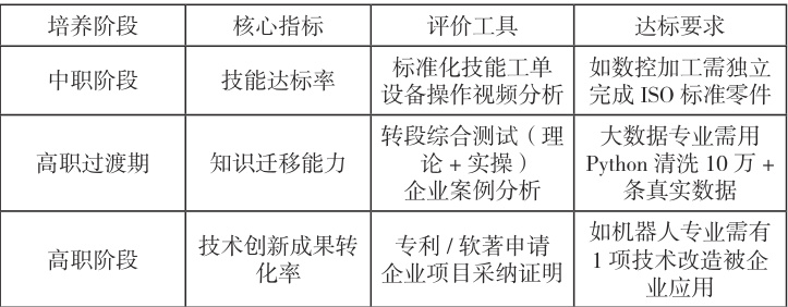3.4 评价改革:构建”螺旋上升”质量环(1)多元评价主体协同机制打破传统单一学校评价模式,构建" 三方联动" 评价体系:企业深度参与(权重30%):大数据专业:邀请企业数据科学家参与项目答辩,评估数据建模的商业价值(如预测准确率、算法效率)。学校过程性评价(权重50%):中职阶段:采用" 技能闯关" 模块化考核(如大数据技术专业需通过10 个技能认证关卡);高职阶段:推行" 项目里程碑" 评审(如大数据技术专业需完成3 个真实数据分析项目)。第三方认证(权重20%):对接"1+X" 证书标准,要求转段学生必须获取初级职业资格证书(如大数据系统平台搭建与运维初级),高职毕业需达到中级以上。(2)阶梯式评价指标设计建立与职业能力等级相匹配的动态评价维度,具体如表4 所示: