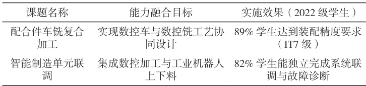 1. 基础层:2023 级新生通过数控加工仿真软件强化单项技能,如数控车螺纹加工课题中,G76 指令应用正确率达 92% ,较 2021 级(传统教学)提升27% 。2. 专项层:跨工种融合项目(车铣复合加工、智能产线联调)覆盖 2022级全体学生,如表1 所示, 82% 的学生能独立完成“机器人上下料 + 数控加工”协同操作。3. 创新层:组织学生参与创新创业大赛,2023 级学生团队基于CDIO流程开发的“多功能模块智慧通行管道机器人”项目以及“多功能模块智慧通行管道机器人”项目分别获得了市级一等奖和获省级三等奖。