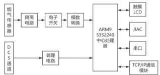 基于烟气在线监测系统的复杂构成,需结合多个模块的协同运作,形成在线监测。以ARM9 S3S2240 中心处理器的烟气在线监测系统为例(图一),其主要用于对烟气中的脱硫数据进行实时监测,可充分利用系统中的各种传感器进行烟气中相关参数的收集,从而将数据信息传递到中心处理器中,对获取的数据参数进行逻辑化处理[2],并将数据信息转化为TCP/IP 形式,实时地展现烟气的具体状况。