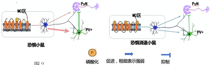 教师继续补充情境资料:研究人员为了探究恐惧反射的消退机制,继续以小鼠为研究材料,发现小鼠恐惧反射的消退与脑内神经元之间的信号传递密切相关。已知PV+ 是一种联络神经元,PyN 是介导恐惧消退的重要神经元,脑内 MC 区神经元膜上某种蛋白质的磷酸化程度可间接影响PyN 神经元的活跃程度(图2)。而后请学生根据图文资料,分析小鼠恐惧反射消退的原理,并尝试设计 PTSD 的治疗方案。设计意图:训练学生从情境中获取信息及解决问题的能力,培养归纳概括、演绎推理的科学思维能力,培养学科核心素养。