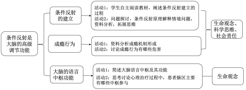 本节课是沪科技版《生物学》选择性必修1《稳态与调节》第 2 章“人体的神经调节”第 4 节内容,是本章的最后一节内容,帮助学生深入认识神经系统调节生命活动的机制和意义。本节对应《课程标准》中的概念 1.3.6简述语言活动和条件反射是由大脑皮层控制的高级神经活动。教材分 2 目,第 1 目以图文的形式介绍了条件反射的形成机制、以及大脑皮层各功能区。第 2 目在第 1 目的基础上提出语言中枢是大脑特有的高级中枢,学习和记忆也是大脑的高级活动,最后安排了探究活动,成瘾的生理基础及危害,作为生命教育素材。通过本章第 1 节的学习,学生知道了条件反射和非条件反射的概念,且具备一定的自主学习和观察认知能力,逻辑思维也已初步建立,但仍不完善,充满好奇心的同时,又存在盲目性,因此教学过程中设计了一系列具体问题引导学生讨论,由此落实核心概念。本节课的设计思路如图 1所示: