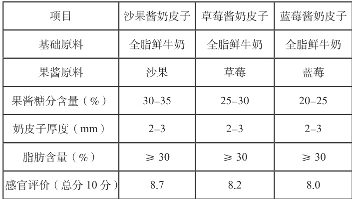 三种不同果酱奶皮子配方如表 1 所示。基于对比与数据分析,可以进行以下几点优化:(1)调整果酱糖分与酸度:根据消费者口味偏好与市场调研结果,可适当调整沙果酱的糖分,以进一步提升产品的口感与风味。(2)优化奶皮子制作工艺:通过试验探索更佳的牛奶加热温度、时间与拂动频率等工艺参数,以提高奶皮子的质量与产量。