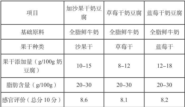 三种不同果干奶豆腐配方如表 1 所示。基于对比与数据分析,可以进行以下几点优化:(1)根据市场调研与消费者反馈,可适当调整果干的添加量,以平衡果干风味与奶豆腐口感的协调性。(2)营养成分强化:在保持产品风味与口感的基础上,可通过添加功能性原料(如益生元、膳食纤维等)来强化奶豆腐的营养成分与健康价值。