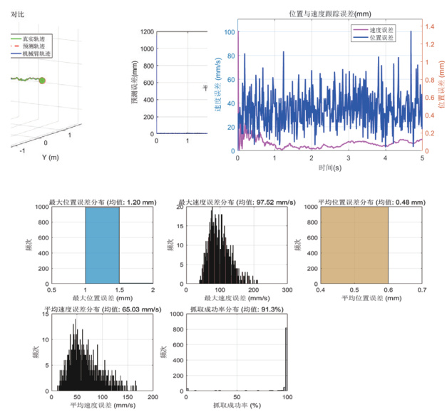 初始状态 πX0 设为首次观测到的目标位置(单位:m)与零速度假设,初始协方差矩阵 P0 设定为对角矩阵 P0=1×10-3⋅I6 。在 UR5 机械臂的实际抓取任务仿真测试中,基于本预测方法的抓取成功率从传统方法的低水平显著提升至 91.3% ,抓取时间优化至 2.4s⨀ 。
