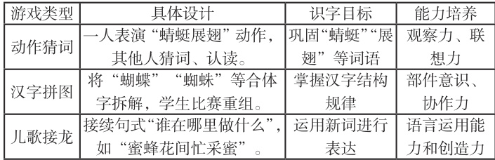 游戏是儿童的天性,也是有效的学习方式。设计精巧的游戏情境能够激发学生的内在动机,实现“玩中学”的理想状态。如在《动物儿歌》识字教学中,可开发以下游戏矩阵: