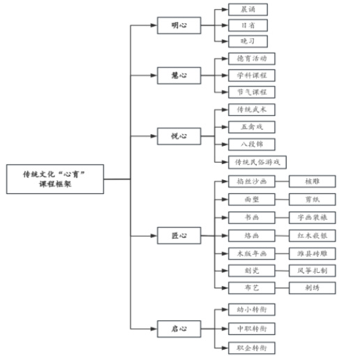 活态传承的核心在于通过系统性实践实现文化延续,课程作为教育的核心载体,是非遗融入聋校育人体系的基础。学校结合听障学生认知特点,构建了“全学段进阶 + 动态实践”的传统文化“心育”课程体系(见图1)。本课程遵循“基础认知—技能深化—职业定向”三阶逻辑,学前至 6 年级以非遗故事、简易纹样模仿为切入点,培养文化感知与手部精细动作;7-9 年级及中专低段系统引入红木嵌银、核雕等 14 项非遗技艺,强化规范性训练;中专高段则聚焦技艺创新与市场化转化,开设“非遗文创设计”等应用型课程,引导学生从“学习者”向“创作者”转变。采用跨年级选课走班制,每周设置“非遗技能学习日”,保障学生自主选择与深度参与。这套课程体系既确保了非遗技艺的系统性传承,又通过学生的持续参与让文化基因融入成长过程。