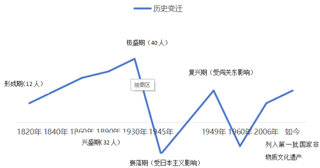 图1 :海城高跷秧歌的历史变迁 数据来源:鞍山市地方志记载(-1980)与海城市高跷团体访谈结果(1980-2020)