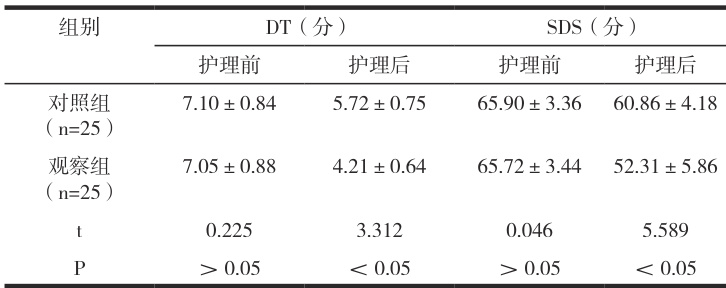 2.1 两组患者心理评估对比观察组DT、SDS 低于对照组( P<0.05 )。详见表1。