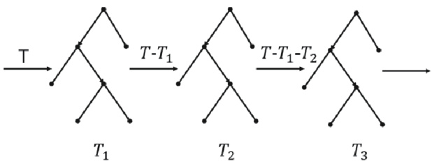 从图 1 可以看出,GBDT 的训练过程是线性的,无法像随机森林一样并行训练决策树。第一棵决策树训练的结果与真实值的残差是第二棵树训练优化的目标,即,第三棵树训练优化的目标是真实值与第一棵和第二棵决策树训练的结果和的残差,即,以此类推,最终模型得到的结果是将每一棵决策树的结果进行加和得到的,即。
