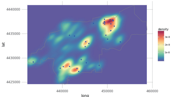 使用模型对清河流域的积水点进行预测,得到预测结果后通过高斯核密度法对输出数据进行处理,以做出可视化的内涝风险密度图,结果如图3 所示。