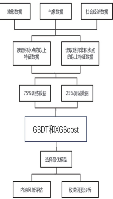 采用Python 语言构建城市内涝风险评估流程,整体技术路线包括:多源数据处理、训练样本构建、机器学习模型训练与优化、内涝风险预测与可视化、主导致涝因子提取等五大步骤。首先,基于积水点及非积水点空间位置,提取其对应网格的特征值,并通过周边采样方式扩充训练样本集。然后选取两类典型机器学习模型 GBDT 与XGBoost 进行建模评估。