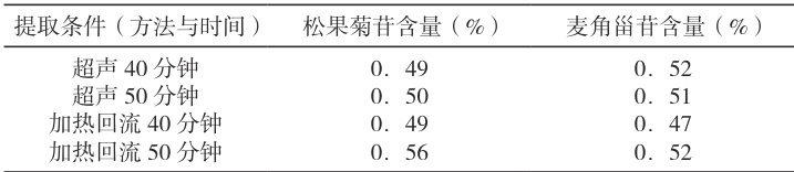 实验结果中虽然加热回流 50 分钟这种方法测得的含量最高,但由于它的杂质干扰多,且峰形不好,故选择超声50 分钟。