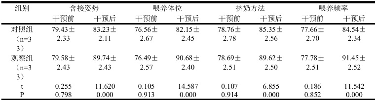 妇进行正确哺乳姿势的指导,告诉其哺乳之前必须洗手,并且在乳房上用热毛巾进行热敷。喂奶的过程中需要保持坐位或侧卧,抱着新生儿的时候应该保证其包含大部分乳晕以及整个乳头。③护理人员对初产妇开展乳房护理知识的讲解,在此期间也应该充分考虑到其具体情况进行个体化教育。初乳出现时会出现结痂的情况,可以使用温水进行清洗,在此期间不能使用肥皂等物品。每天使用干净的毛巾对乳房进行清洗,如果存在乳房受伤或发痒等症状,可以将少量的油涂抹于乳头上。针对出现乳房内陷的初产妇,可以对其乳房进行相关操作,双手大拇指从乳房靠近乳头位置对乳房进行按压,并且向外推至乳晕位置,直到乳头能够清晰地露出。 ④ 为使得产奶量进一步增加,应该叮嘱初产妇保持早喂、常喂的原则,还可以通过吸奶器刺激母乳。在此过程中叮嘱初产妇对新生儿排尿情况进行密切的观察,并且掌握正确的尿不湿更换方式。