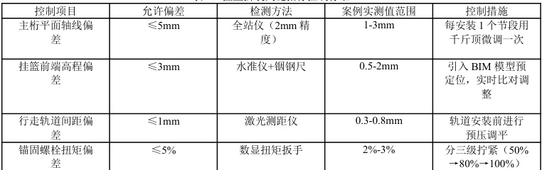 挂篮拼装是确保后续施工精度的基础,严格控制以下指标(表 1),并采取针对性措施: