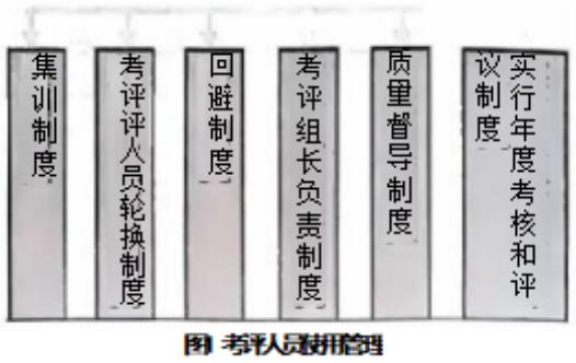 依据相关部门颁布的关于职业技能鉴定考评人员 管理要求,省级相关部门会根据自身实情制定更为 合理的考评员管理方式,一般有聘任制及资格准入 制两种形式,具体地方使用形式也是不一样的。对 考评人员进行使用管理时,会根据考评前情况制定 较为完善的集训制度,还会依据使用的具体情况建 立符合实际的回避制度或考评人员轮换制度、质量 督导及考评组长负责制度、年度考核和评议制度等 ( 见图 1)。