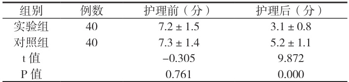 护理前,比较两组患者的 VAS 评分,无统计学意义( P>0.05) ;治疗后,两组患者 VAS 评分均有显著降低,且实验组较对照组显著降低,有统计学意义(P<0.05),详见表1。