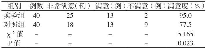 实验组患者的护理满意度为 95.0% ,显著高于对照组的77.5% ,差异有统计学意义( P<0.05 )。详见表 2。