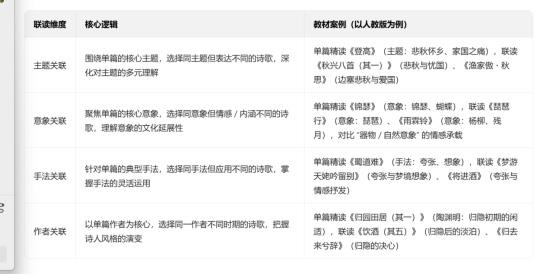联读文本不是任意拼凑,要以“单篇精读的核心目标”为锚点,从“主题、意象、手法、作者”四个维度筛选,做到“联读为精读服务,精读为联读奠基”,具体策略如下: